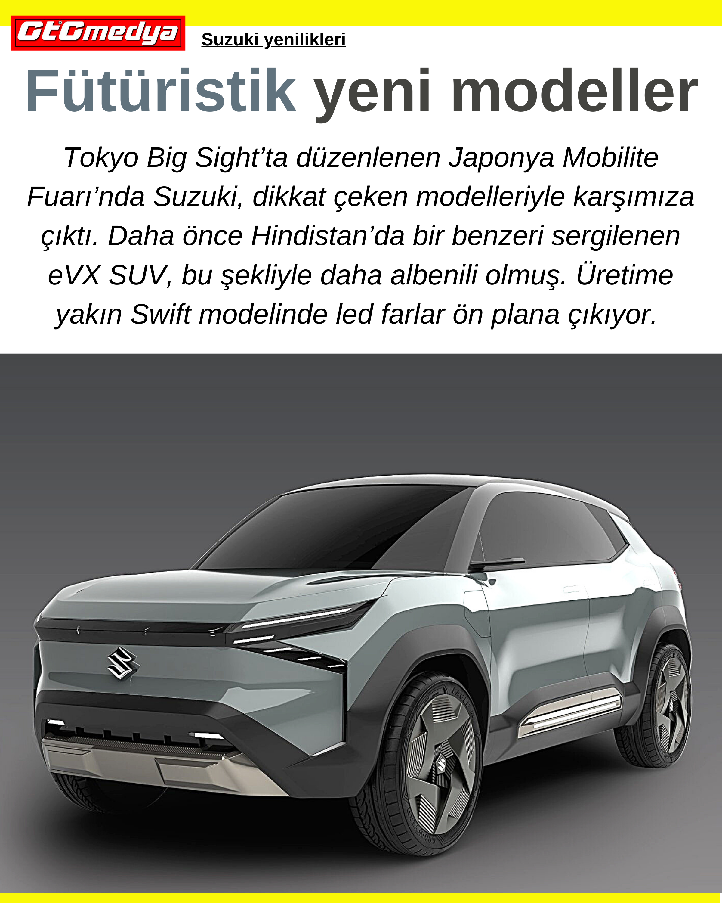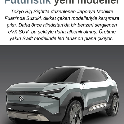 Tokyo Big Sight’ta düzenlenen Japonya Mobilite Fuarı’nda Suzuki, dikkat çeken modelleriyle karşımıza çıktı. Daha önce Hindistan’da bir benzeri sergilenen eVX SUV, bu şekliyle daha albenili olmuş. Üretime yakın Swift modelinde led farlar ön plana çıkıyor.