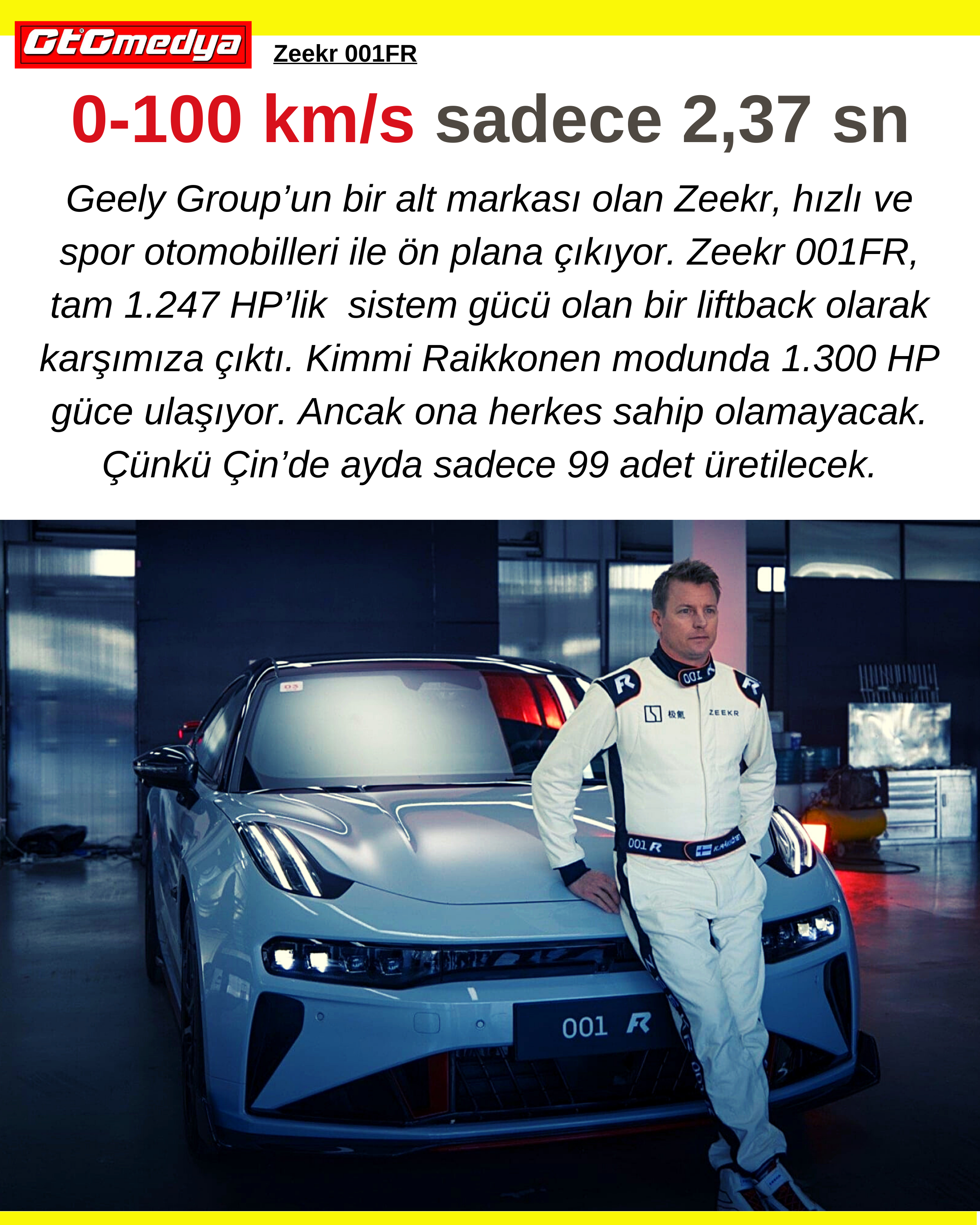Geely Group’un bir alt markası olan Zeekr, hızlı ve spor otomobilleri ile ön plana çıkıyor. Zeekr 001FR, tam 1.247 HP’lik sistem gücü olan bir liftback olarak karşımıza çıktı. Kimmi Raikkonen modunda 1.300 HP güce ulaşıyor. Ancak ona herkes sahip olamayacak. Çünkü Çin’de ayda sadece 99 adet üretilecek.
