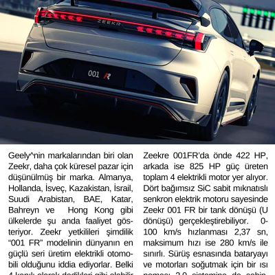 Geely^nin markalarından biri olan Zeekr, daha çok küresel pazar için düşünülmüş bir marka. Almanya, Hollanda, İsveç, Kazakistan, İsrail, Suudi Arabistan, BAE, Katar, Bahreyn ve Hong Kong gibi ülkelerde şu anda faaliyet gösteriyor. Zeekr yetkilileri şimdilik “001 FR” modelinin dünyanın en güçlü seri üretim elektrikli otomobili olduğunu iddia ediyorlar. Belki 4 kapılı olarak dedikleri gibi olabilir ve Lotus Evija ve 1.914 HP’lik Rimac Nevera’nın gerisinde.