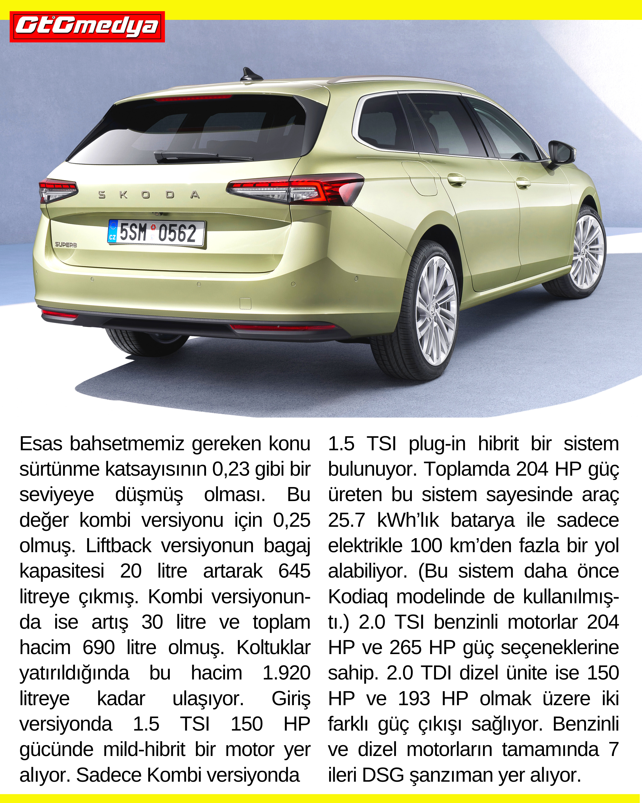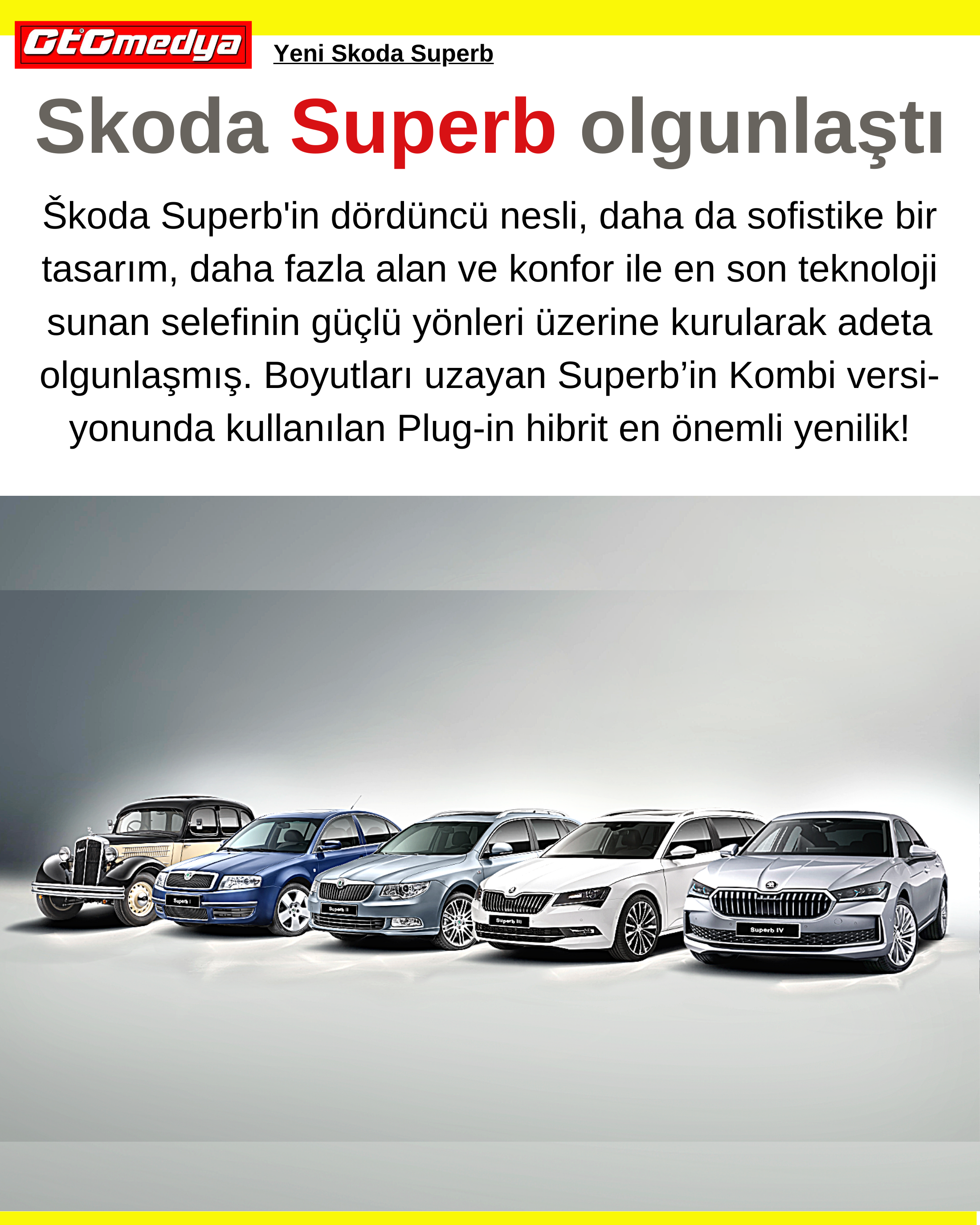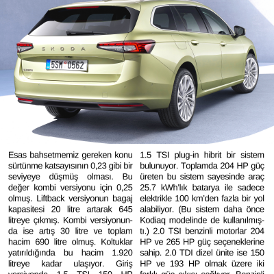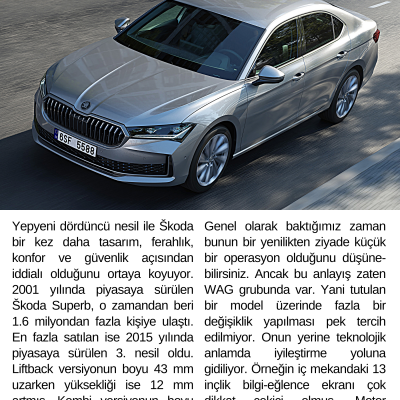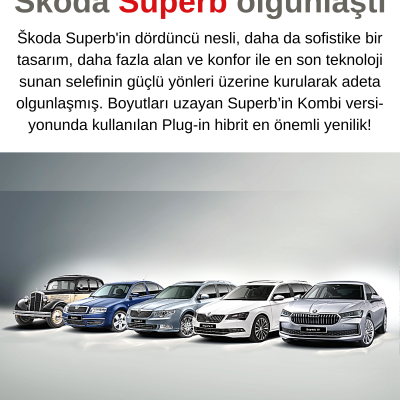 Škoda Superb'in dördüncü nesli, daha da sofistike bir tasarım, daha fazla alan ve konfor ile en son teknoloji sunan selefinin güçlü yönleri üzerine kurularak adeta olgunlaşmış. Boyutları uzayan Superb’in Kombi versiyonunda kullanılan Plug-in hibrit en önemli yenilik!