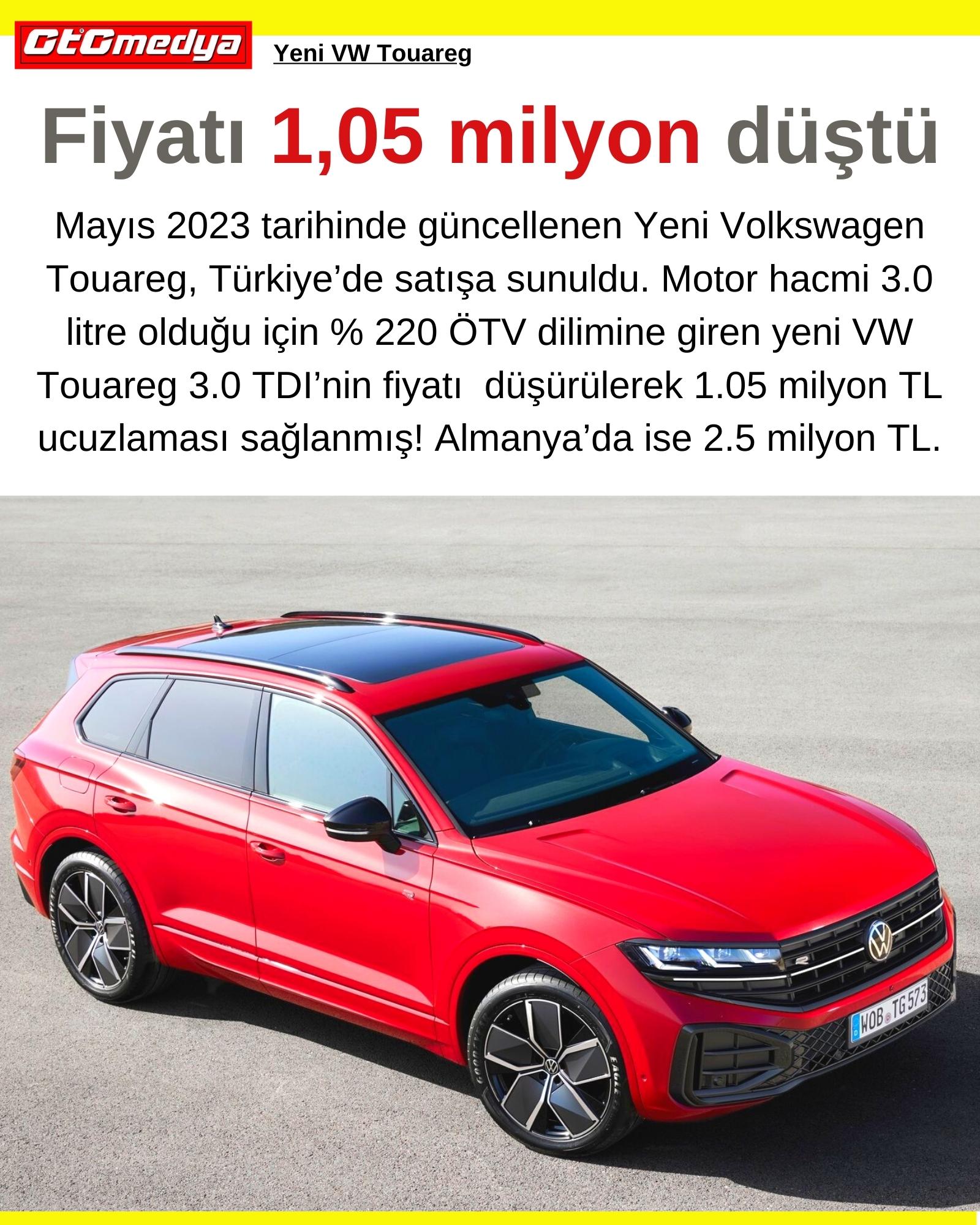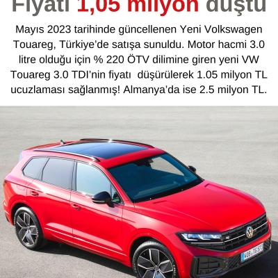 Mayıs 2023 tarihinde güncellenen Yeni Volkswagen Touareg, Türkiye’de satışa sunuldu. Motor hacmi 3.0 litre olduğu için % 220 ÖTV dilimine giren yeni VW Touareg 3.0 TDI’nin fiyatı düşürülerek 1.05 milyon TL ucuzlaması sağlanmış! Almanya’da ise 2.5 milyon TL.