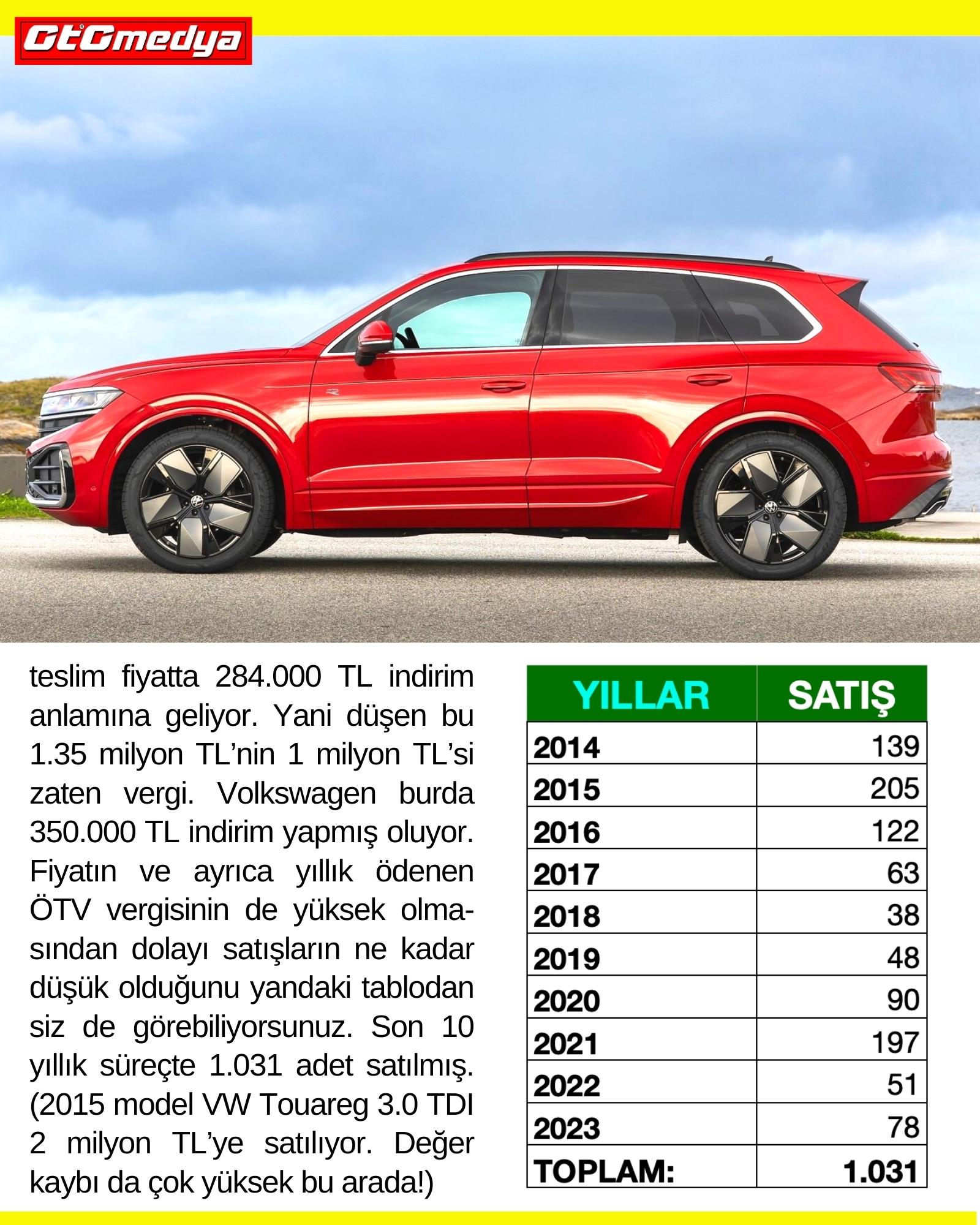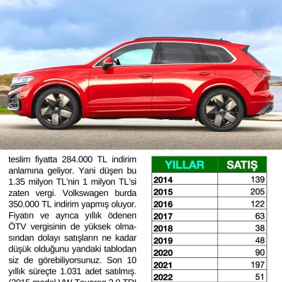 Peki VW Touareg’in anavatanı Almanya’da kaça satıldığına bakıyoruz: 69.200 Euro’dan başlıyor. R-Line versiyonu ise 79.660 Euro. TL’ye çevirdiğimizde 2.5 milyon TL gibi bir rakam karşımıza çıkıyor. (Artık yorumu size bırakıyoruz.) Türkiye’de satılan bir önceki Touareg’deki 3.0 TDI R-Line’ın Ekim ayı fiyatı 8.150.000 TL seviyesindeydi. Yani yeni VW Touareg ülkemize 1.05 milyon TL ucuzlayarak geldi. (Vergisiz fiyattaki her 100 bin TL indirim anahtar teslim fiyatta 284.000 TL indirim anlamına geliyor.) Yani düşen bu 1.05 milyon TL’nin 780.000 TL’si zaten vergi. Volkswagen burda 270.000 TL indirim yapmış oluyor. Fiyatın ve ayrıca yıllık ödenen ÖTV vergisinin de yüksek olmasından dolayı satışların ne kadar düşük olduğunu resimlerdeki tablodan siz de görebilirsiniz. Son 10 yıllık süreçte 1.031 adet satılmış. (2015 model VW Touareg 3.0 TDI 2 milyon TL’ye satılıyor. Değer kaybı da çok yüksek bu arada!)
