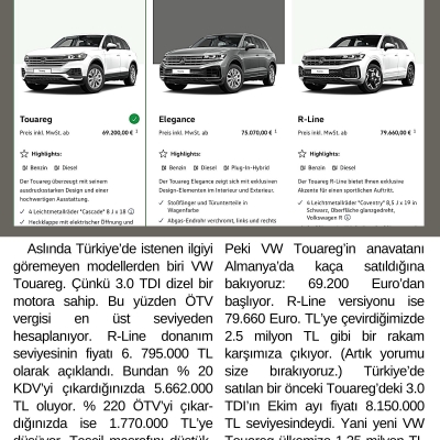 Aslında Türkiye’de istenen ilgiyi göremeyen modellerden biri VW Touareg. Çünkü 3.0 TDI dizel bir motora sahip. Bu yüzden ÖTV vergisi en üst seviyeden hesaplanıyor. R-Line donanım seviyesinin fiyatı 7.095.000 TL olarak açıklandı. Bundan % 20 KDV’yi çıkardığınızda 5.912.000 TL oluyor. % 220 ÖTV’yi çıkardığınızda ise 1.870.000 TL’ye düşüyor. Tescil masrafını düştükten sonra araçtan 5.225.000 TL vergi alındığı ortaya çıkıyor.