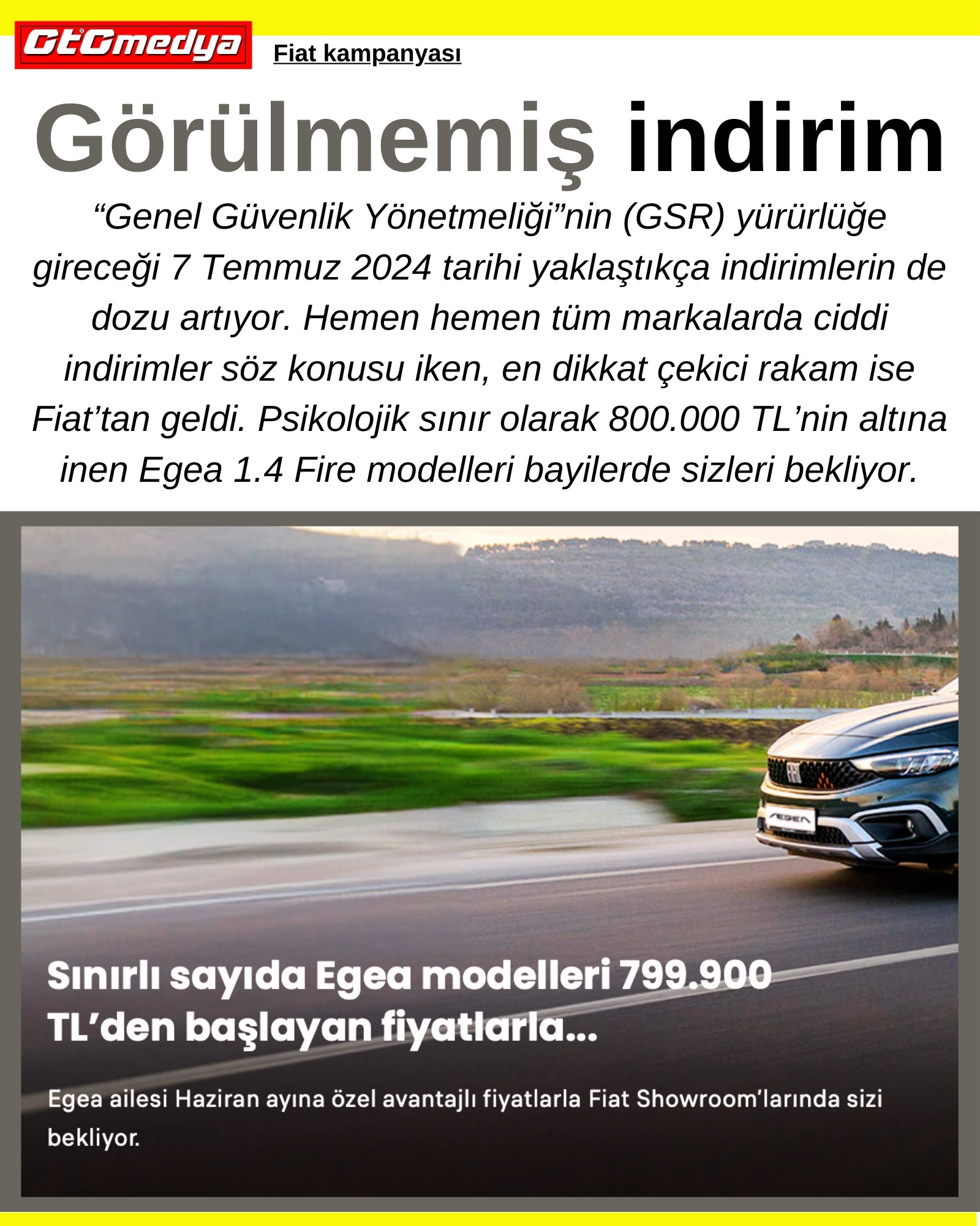 800.000 TL’yi psikolojik olarak görürsek; bunun da altına inen Fiat, Egea Sedan’ın sadece 1.4 Fire benzinli versiyonunda özel bir indirime gitti. Kampanya kapsa-mında belirtilen 799.900 TL fiyat, Egea Sedan 1.4 Fire 95 HP modelinde tavsiye edilen anahtar teslim liste fiyatı üzerinden nakit indirim uygulanmış şekilde hesap-lanmış olup, metalik renk ile ekstra donanımları içermiyor. Bu arada bu kampanya diğer kredi kampanyaları ile birleştirilemiyor.