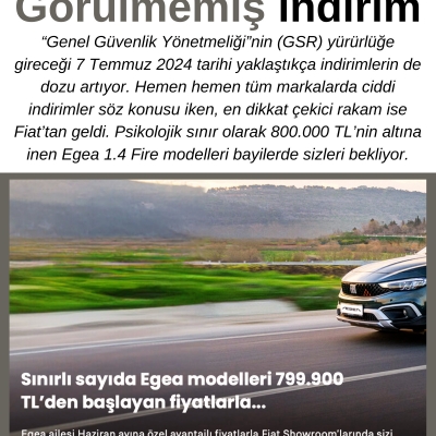 “Genel Güvenlik Yönetmeliği”nin (GSR) yürürlüğe gireceği 7 Temmuz 2024 tarihi yaklaştıkça indirimlerin de dozu artıyor. Hemen hemen tüm markalarda ciddi indirimler söz konusu iken, en dikkat çekici rakam ise Fiat’tan geldi. Psikolojik sınır olarak 800.000 TL’nin altına inen Egea 1.4 Fire modelleri bayilerde sizleri bekliyor.