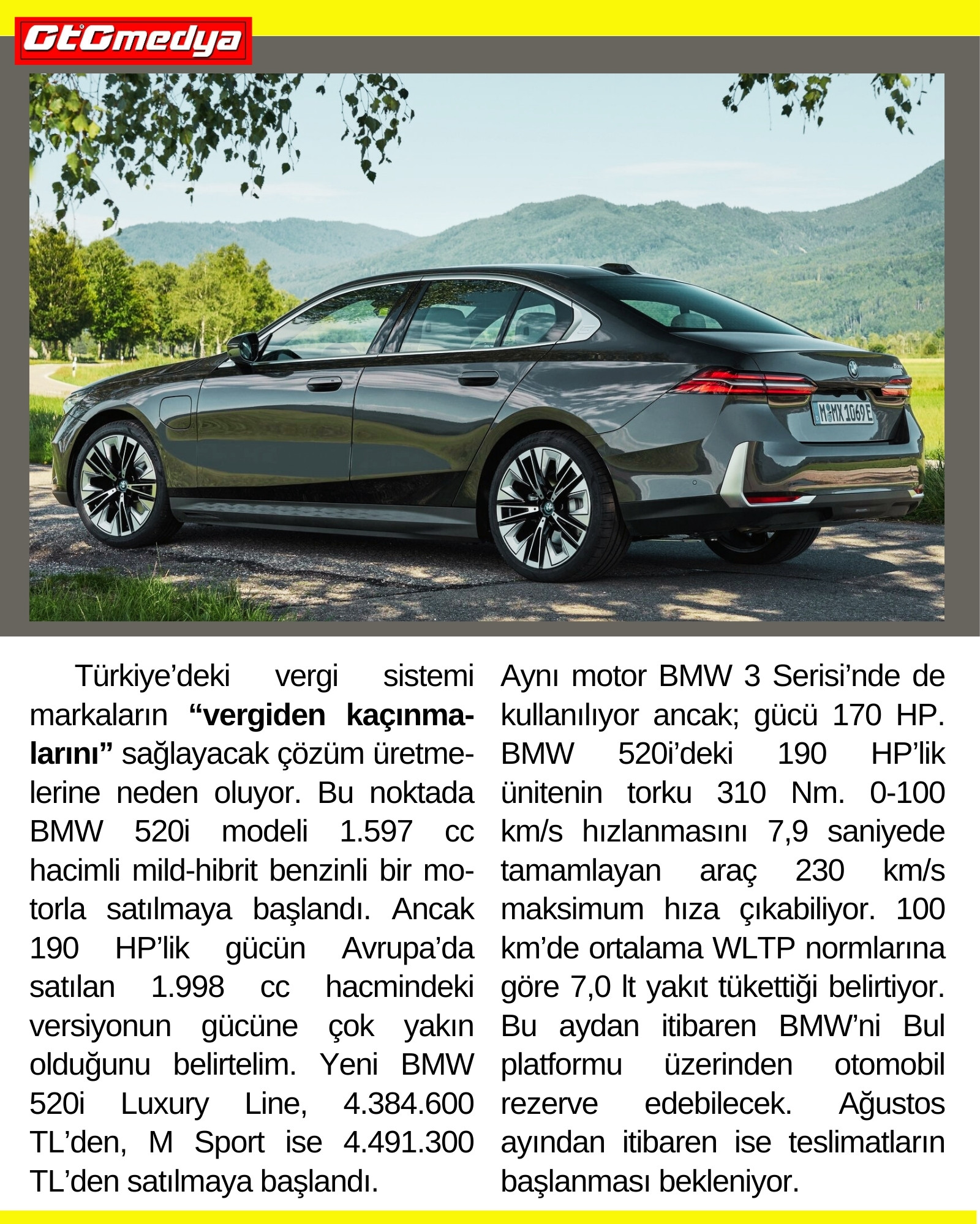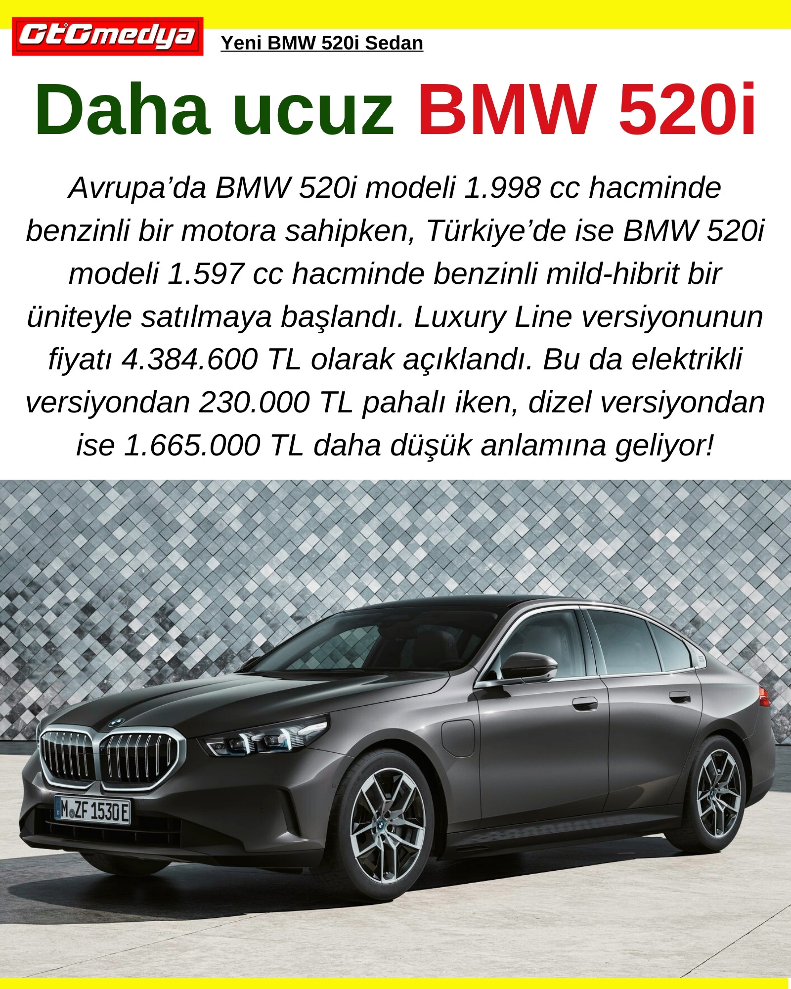 Avrupa’da BMW 520i modeli 1.998 cc hacminde benzinli bir motora sahipken, Türkiye’de ise BMW 520i modeli 1.597 cc hacminde benzinli mild-hibrit bir üniteyle satılmaya başlandı. Luxury Line versiyonunun fiyatı 4.384.600 TL olarak açıklandı. Bu da elektrikli versiyondan 230.000 TL pahalı iken, dizel versiyondan ise 1.665.000 TL daha düşük anlamına geliyor!