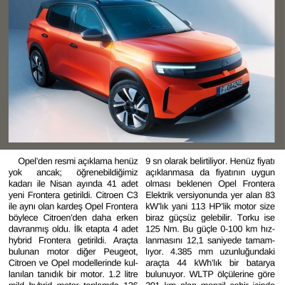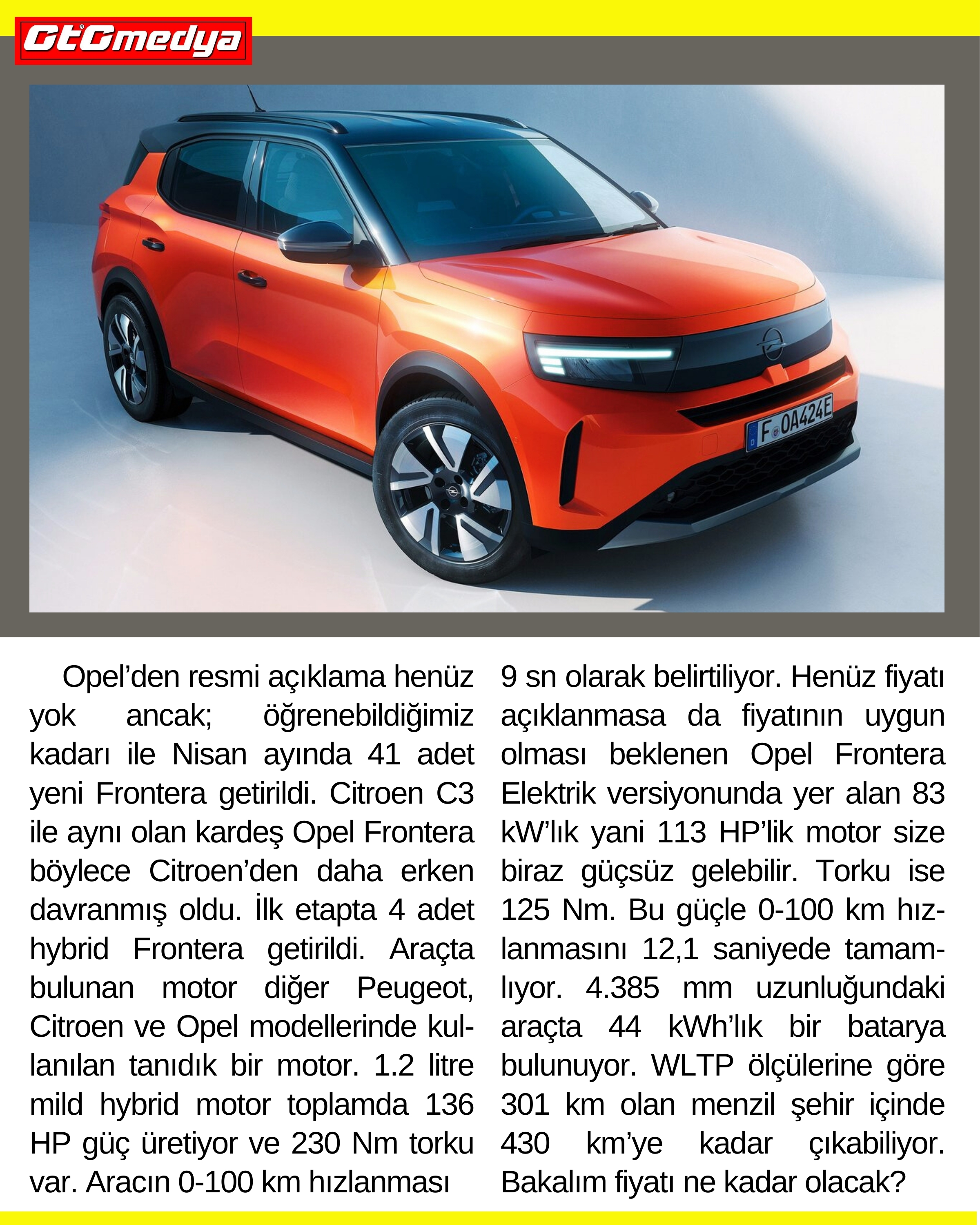 Opel’den resmi açıklama henüz yok ancak; öğrenebildiğimiz kadarı ile Nisan ayında 41 adet yeni Frontera getirildi. Citroen C3 ile aynı olan kardeş Opel Frontera böylece Citroen’den daha erken davranmış oldu. İlk etapta 4 adet hybrid Frontera getirildi. Araçta bulunan motor diğer Peugeot, Citroen ve Opel modellerinde kullanılan tanıdık bir motor. 1.2 litre mild hybrid motor toplamda 136 HP güç üretiyor ve 230 Nm torku var. Aracın 0-100 km hızlanması 9 sn olarak belirtiliyor.