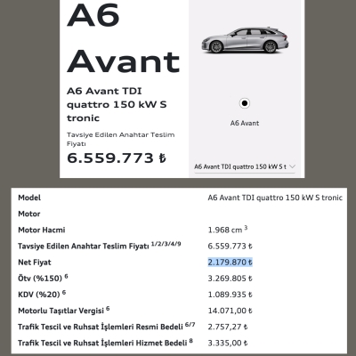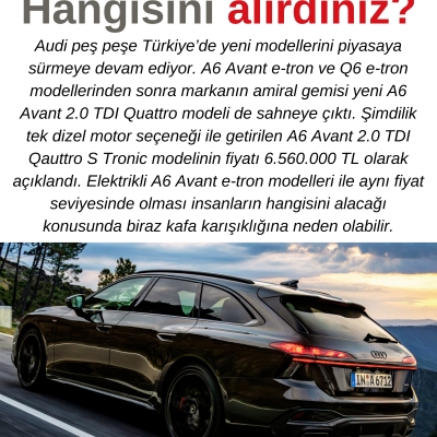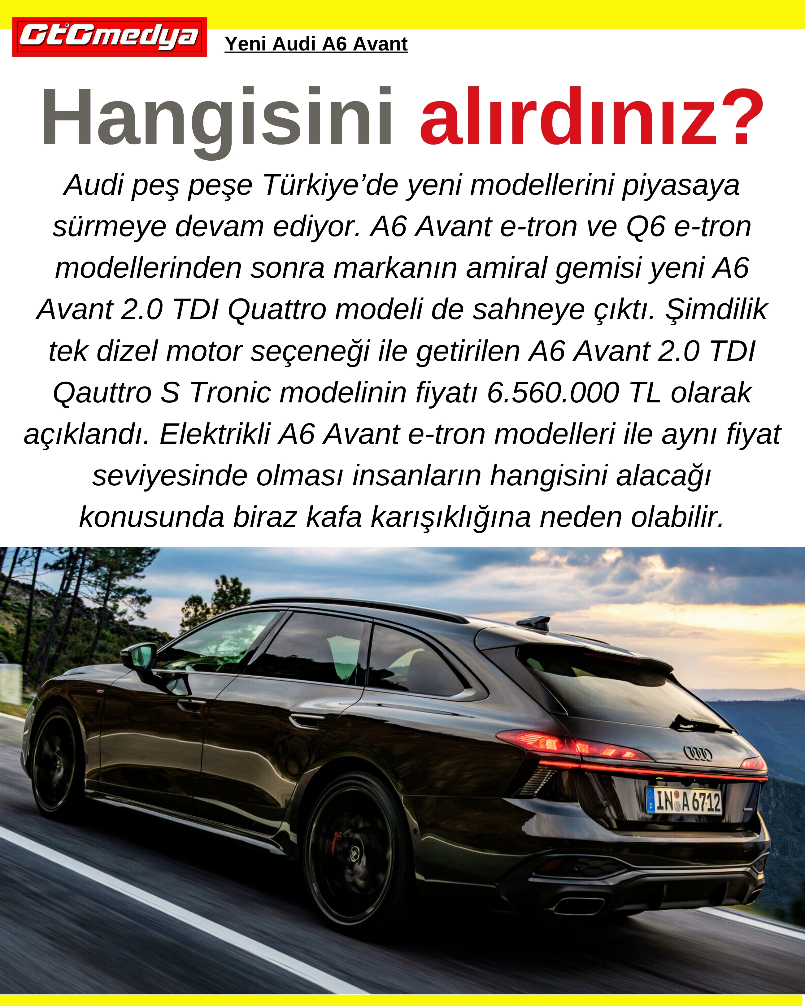 Audi peş peşe Türkiye’de yeni modellerini piyasaya sürmeye devam ediyor. A6 Avant e-tron ve Q6 e-tron modellerinden sonra markanın amiral gemisi yeni A6 Avant 2.0 TDI Quattro modeli de sahneye çıktı. Şimdilik tek dizel motor seçeneği ile getirilen A6 Avant 2.0 TDI Qauttro S Tronic modelinin fiyatı 6.560.000 TL olarak açıklandı. Elektrikli A6 Avant e-tron modelleri ile aynı fiyat seviyesinde olması insanların hangisini alacağı konusunda biraz kafa karışıklığına neden olabilir.