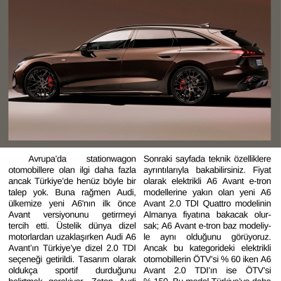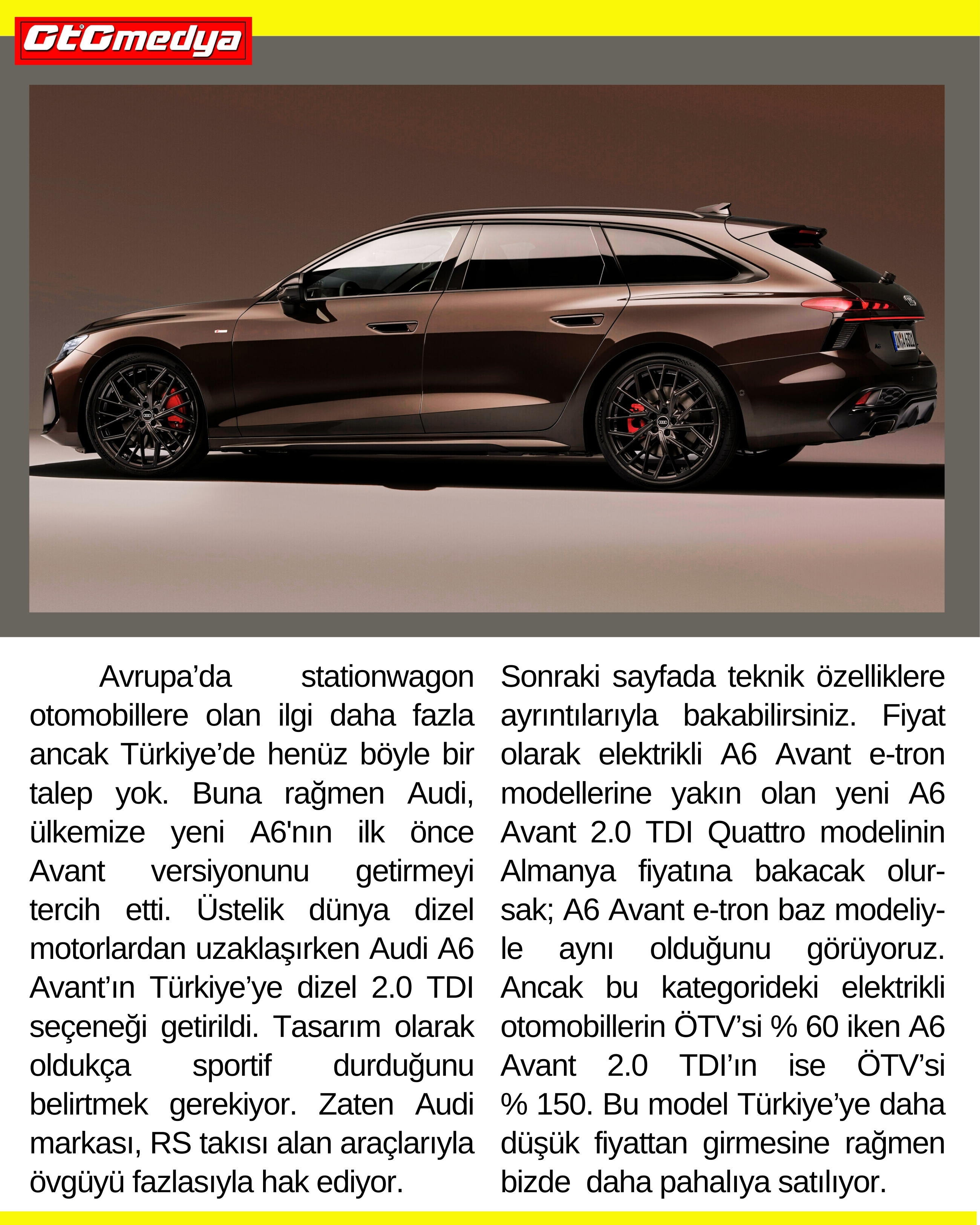 Avrupa’da stationwagon otomobillere olan ilgi daha fazla ancak Türkiye’de henüz böyle bir talep yok. Buna rağmen Audi, ülkemize yeni A6'nın ilk önce Avant versiyonunu getirmeyi tercih etti. Üstelik dünya dizel motorlardan uzaklaşırken Audi A6 Avant’ın Türkiye’ye dizel 2.0 TDI seçeneği getirildi. Tasarım olarak oldukça sportif durduğunu belirtmek gerekiyor. Zaten Audi markası, RS takısı alan araçlarıyla övgüyü fazlasıyla hak ediyor.