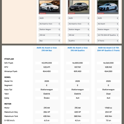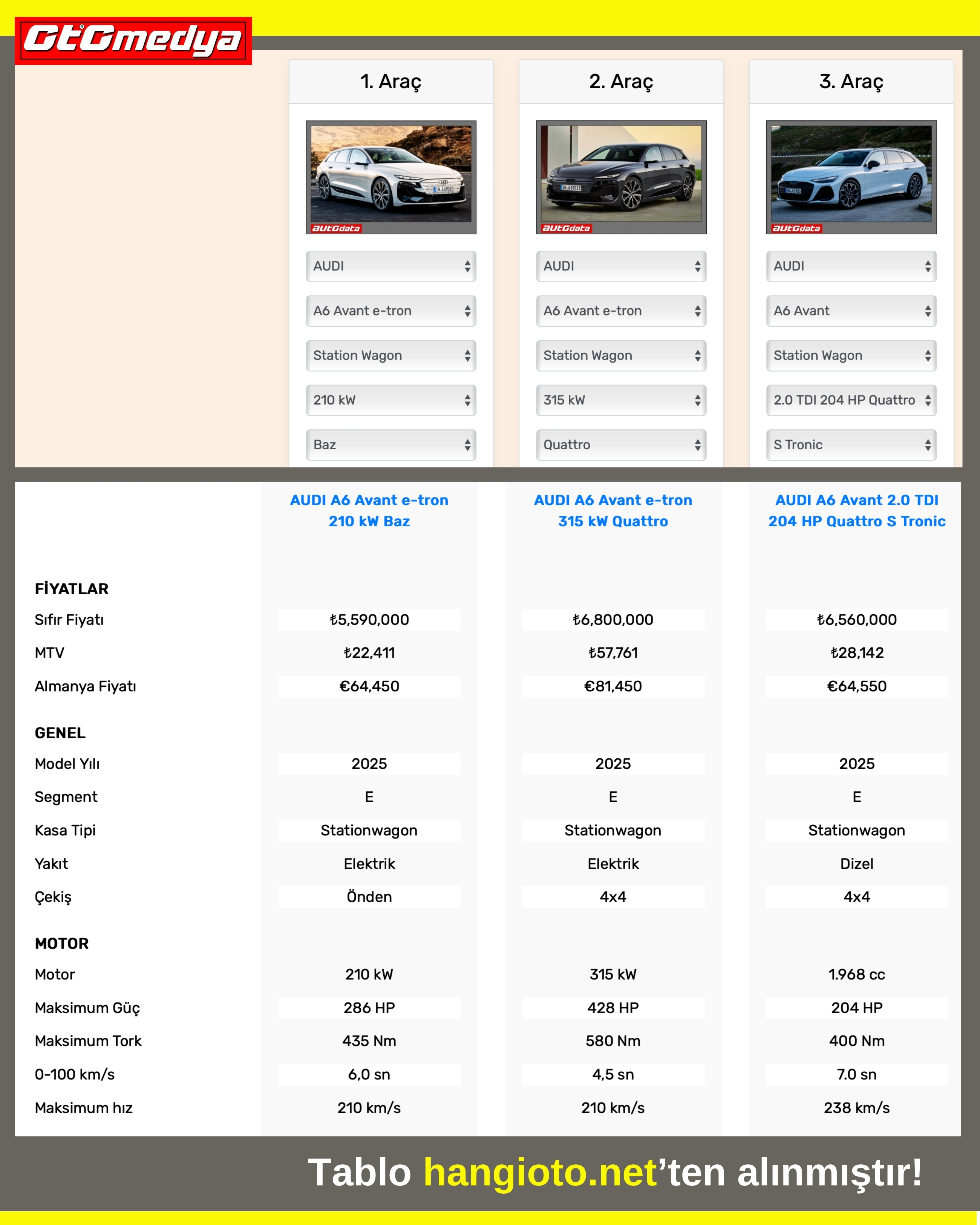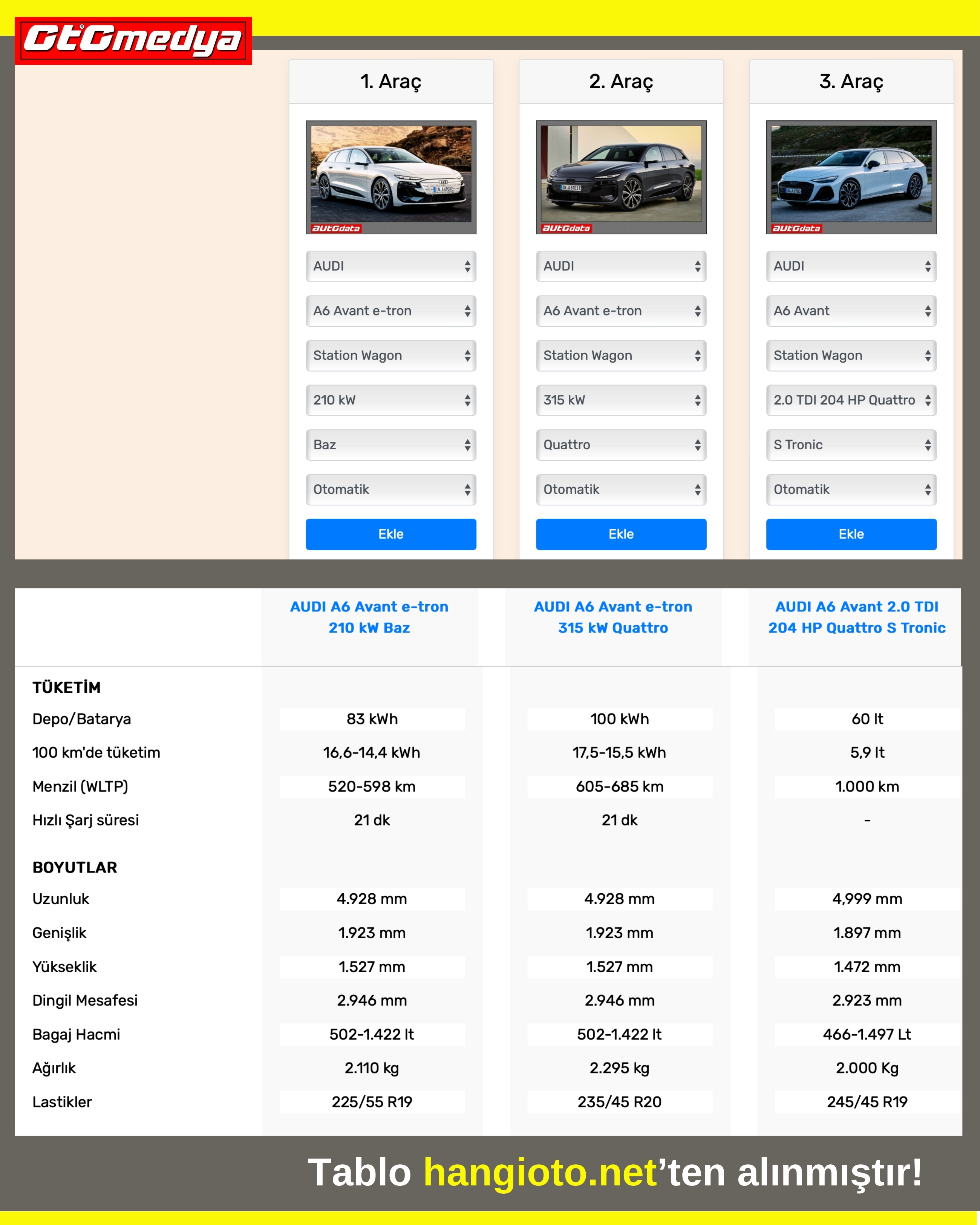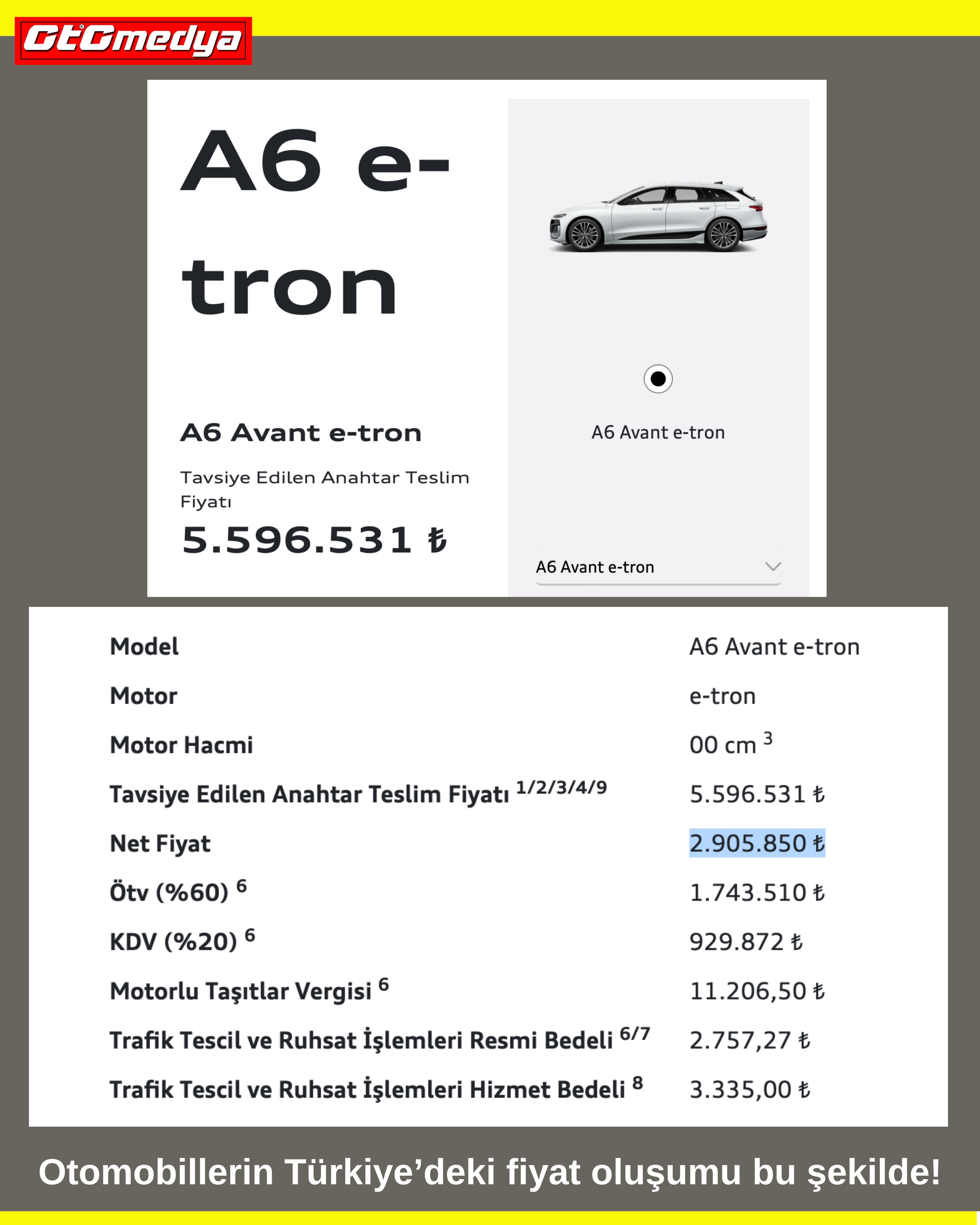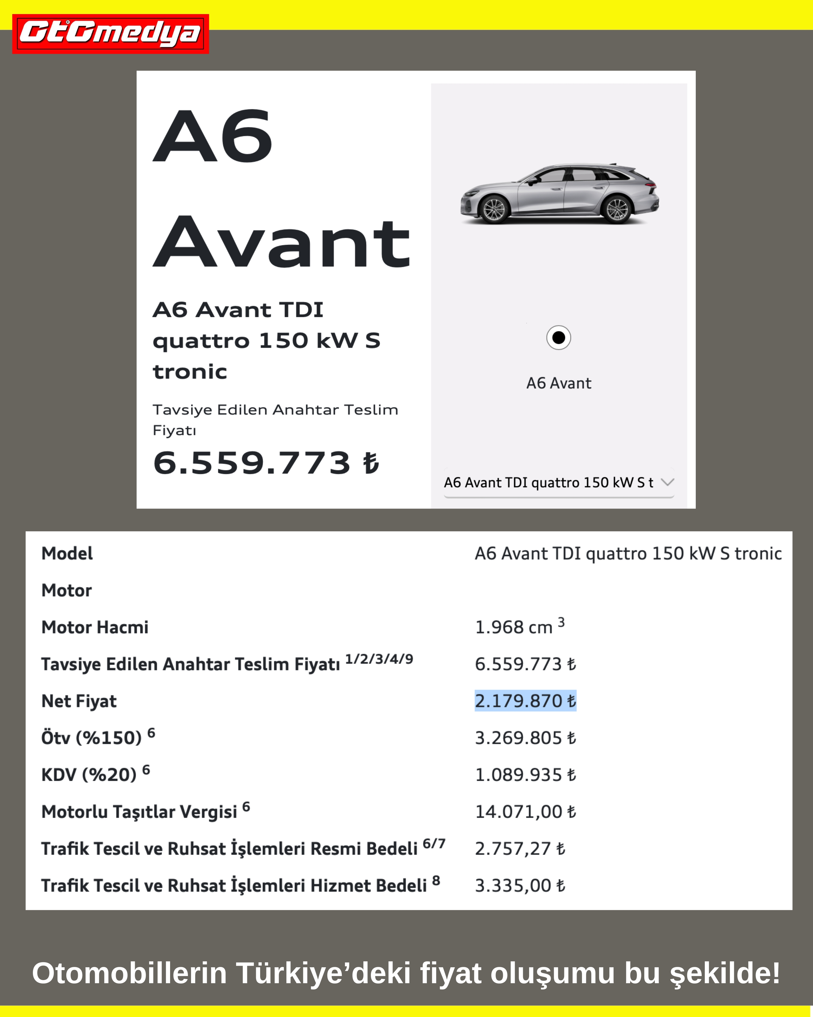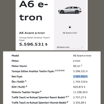 Sonraki sayfada teknik özelliklere ayrıntılarıyla bakabilirsiniz. Fiyat olarak elektrikli A6 Avant e-tron modellerine yakın olan yeni A6 Avant 2.0 TDI Quattro modelinin Almanya fiyatına bakacak olursak; A6 Avant e-tron baz modeliy-le aynı olduğunu görüyoruz. Ancak bu kategorideki elektrikli otomobillerin ÖTV’si % 60 iken A6 Avant 2.0 TDI’ın ise ÖTV’si % 150. Bu model Türkiye’ye daha düşük fiyattan girmesine rağmen bizde daha pahalıya satılıyor.